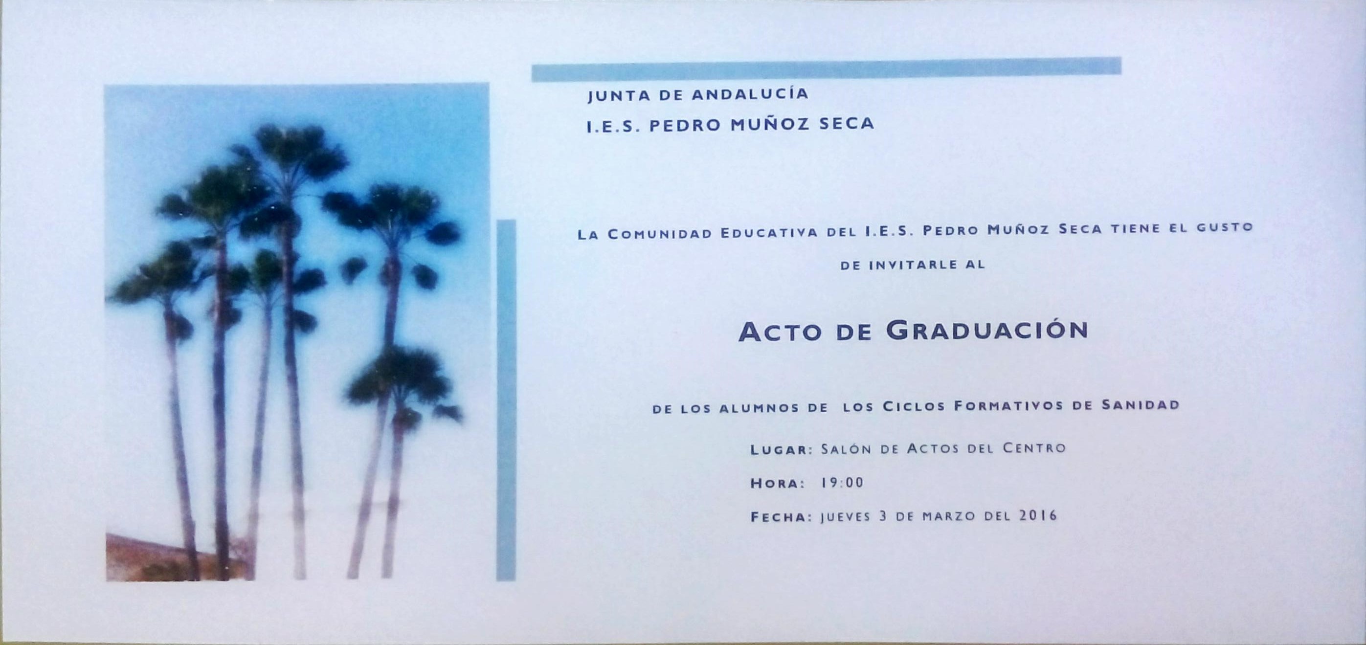 Graduación Ciclos Formativos Sanidad Graduación Ciclos Formativos Sanidad 02/03/2016 admin El próximo jueves 3 de Marzo de 2016 se celebrará en el salón de actos del IES Pedro Muñoz Seca la Graduación de los alumnos de los Ciclos Formativos de Sanidad. Nuestros mejores deseos para la nueva etapa que están a punto de comenzar.