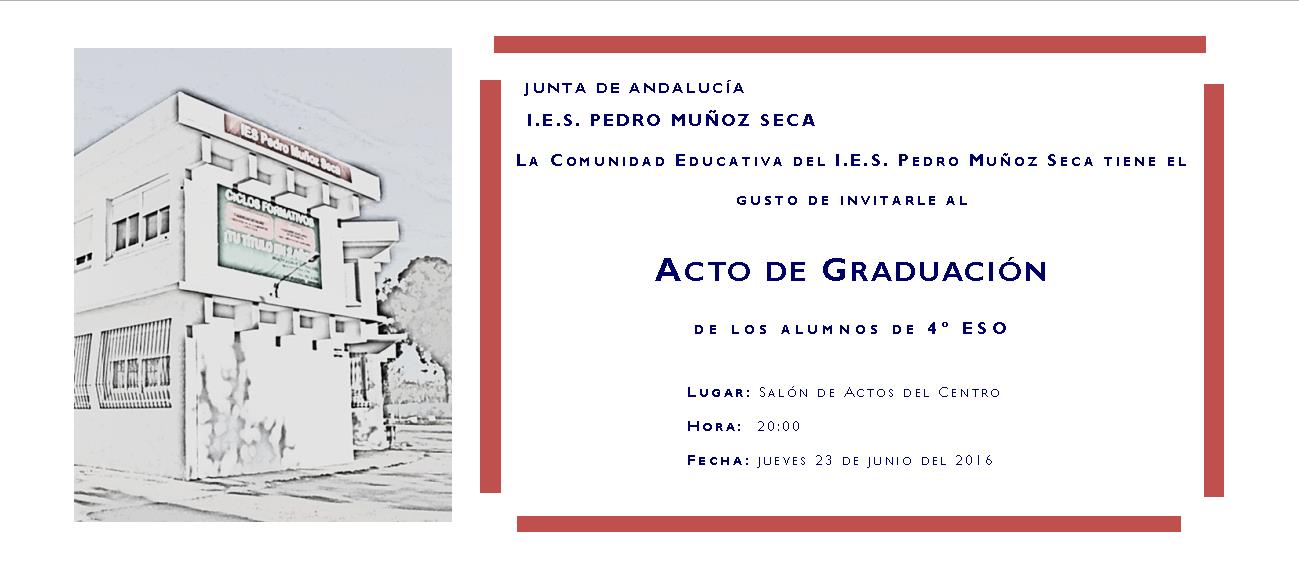 Acto de Graduación de alumnos de 4º de E.S.O. Acto de Graduación de alumnos de 4º de E.S.O. 21/06/2016 admin El próximo jueves, día 23 de Junio, se celebrará en el salón de actos de nuestro IES, la graduación de los alumnos de 4º de E.S.O.. Nuestros mejores deseos para los nuevos caminos que están a punto de comenzar.